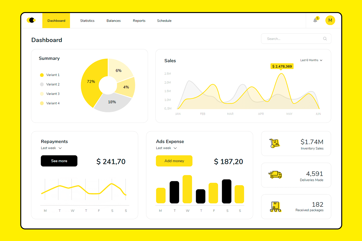 Continuing with our focus on user-friendly designs, this business UI design example makes it easy to keep track of your metrics. The main screen features clear, colorful charts for sales, repayments, and ad expenses, simplifying data analysis.