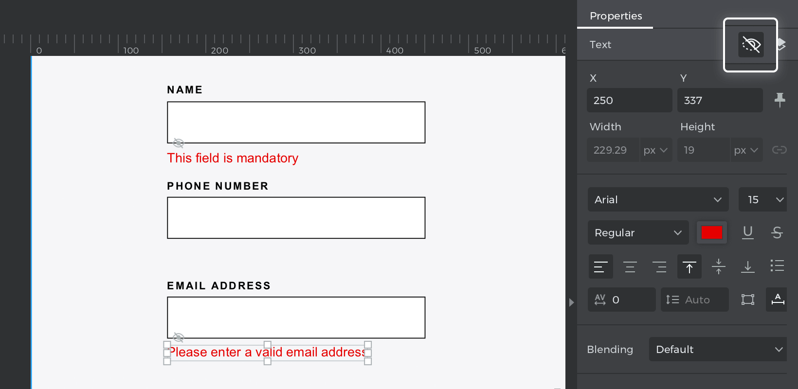 - Place a new “Text” below your last “Input text field” for the email address validation, go to the Properties palette and click the “Hidden in simulation” icon.