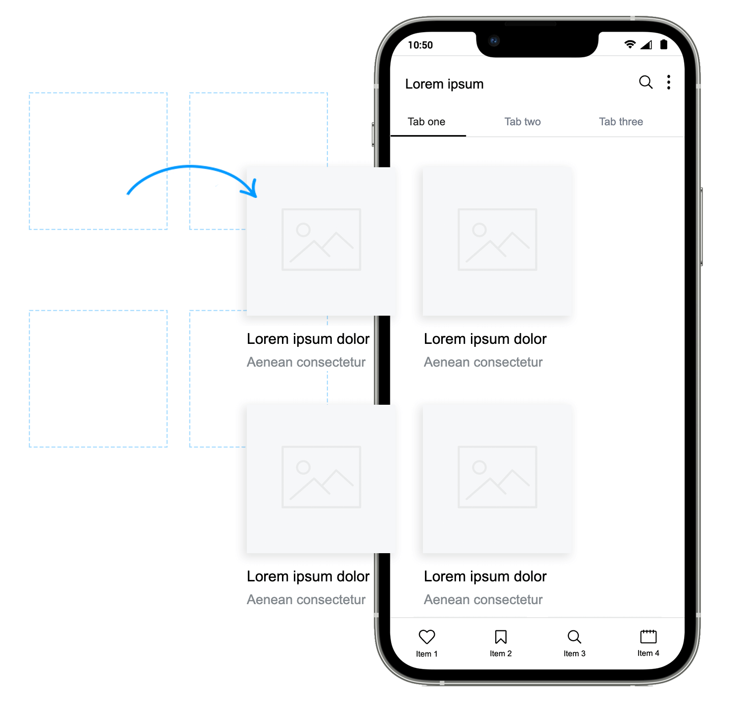 For this screen we’ve used a “Header with tabs” and our previous navigation bar. Then we added a “Simple grid” from the Cards and grids category of the Mobile Wireframing UI library to create each user profile.