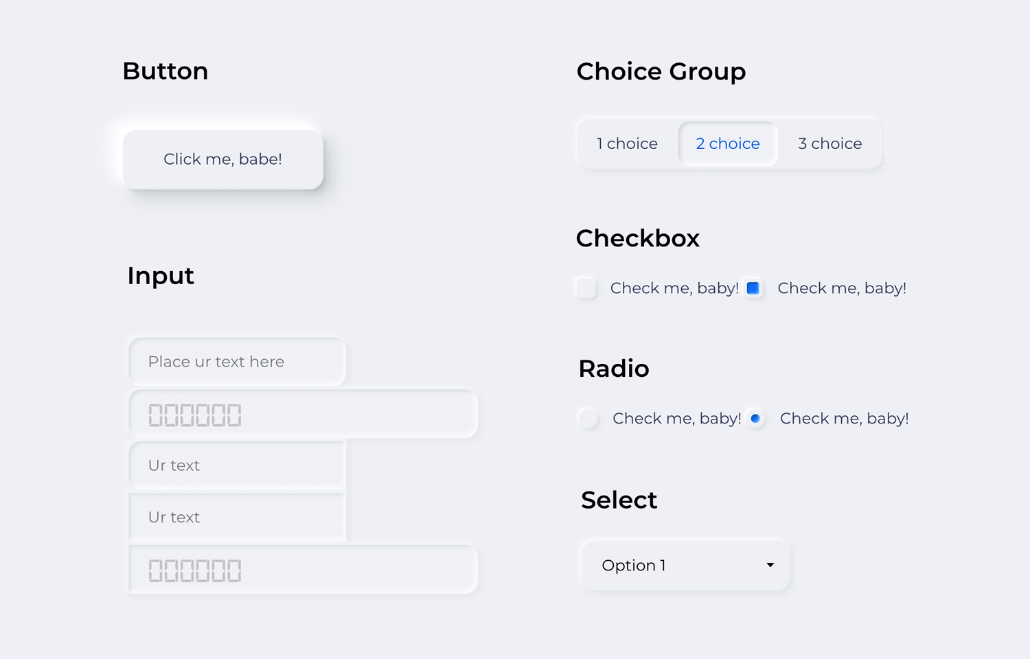 We like that the general UI design feels simple, resulting in a classic neumorphic design. UI components include things like radio and toggle buttons, as well as input fields and buttons. All the basics, covered!