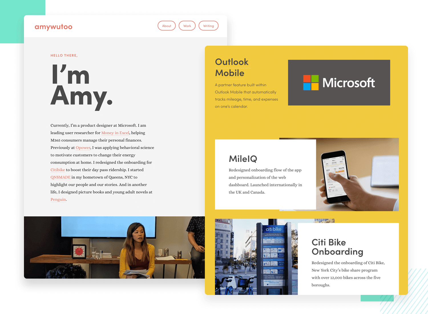 Amy Wu created a beautiful website for her UX design portfolio. It checks all the right boxes, with a wonderful About section and even points to her skills as a writer as well as a designer.